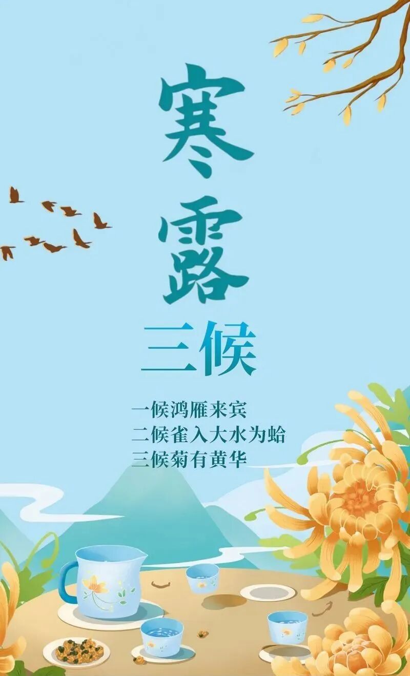 寒露到,天渐凉,记得及时添衣国庆长假结束 秋季的第五个节气寒露 如约而至 寒露与白露尽管都与“露”有关 但白露依色而名 而寒露则依寒而名 寒露时气温比白露时更低 地面的露水更冷 寒露时节有何气候特点? 寒露是二十四节气中 第一个带“寒”的节气 寒露过后 天气转凉为寒 我们要开始领教深秋的肃杀之气了 寒露时节 我国南岭及以北的广大地区 都已进入秋季 东北和西北地区 即将进入冬季 寒露过后 天气转寒 昼夜的温差变大 记得及时添衣保暖 我国古人将寒露时节的十五天 分为三候 一候鸿雁来宾 这个时节 成群的鸿雁排成队列大举南迁 这是最后一批南迁的队伍 古人称后至者为“宾” 二候雀入大水为蛤 深秋天寒 海边突然出现很多蛤蜊 且贝壳的条纹及颜色都与雀鸟相似 人们便以为雀鸟变成了蛤蜊 三候菊始黄华 当百花凋零万叶枯黄时 菊花凌寒怒放 在寒冷刺骨的秋风里 昂首挺胸向秋风挑战 【登高】 重阳节在寒露节气前后 寒露节气宜人的气候又十分适合登山 慢慢的重阳节登高的习俗 也成了寒露节气的习俗 【观红叶】 停车坐爱枫林晚,霜叶红于二月花 漫山红叶如霞似锦、如诗如画 赏红叶 早已成为这个时节 必不可少的重头戏 【饮菊花酒】 “寒露”到来的农历九月又称“菊月” 此时 菊花遍地盛开 为除秋燥 一些地区有饮“菊花酒”的习俗 糯米、酒曲酿制而成菊花酒 古称“长寿酒” 其味清凉甜美 沁人心脾 寒露到 天渐凉 出门别忘添衣裳~ |