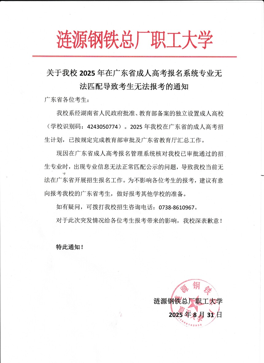 关于我校2025年在广东省成人高考报名系统专业无法匹配导致考生无法报考的通知涟源钢铁总厂职工大学